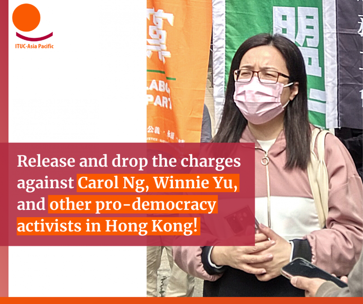 • En virtud de la ley de seguridad nacional (NSL), numerosos sindicalistas en Hong Kong sufren penas de c谩rcel por ejercer pac铆ficamente sus derechos fundamentales a la participaci贸n pol铆tica y a la libertad de expresi贸n. CCOO ha pedido la liberaci贸n de las sindicalistas Carol Ng Man-yee y Winnie Yu Wai-ming